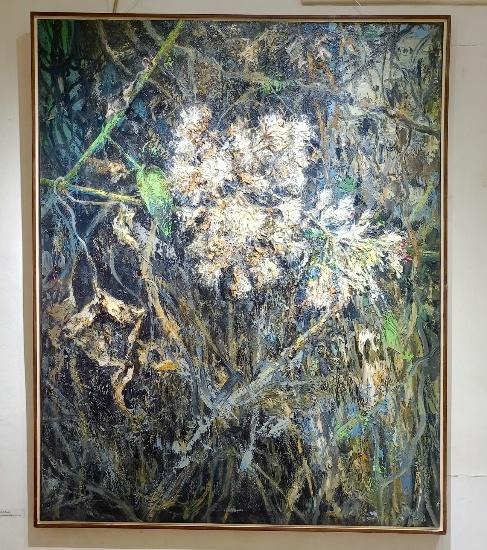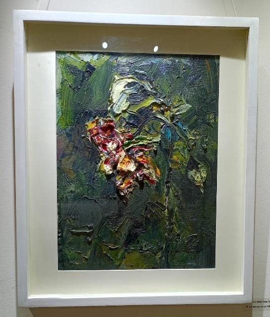 গ্যালারীর আরেকটি কক্ষে টাঙ্গানো “এ অলমোস্ট ডেথ অফ রোজ ফ্লাওয়ার” চিত্রকর্মের কৌশলে বর্ণ প্রয়োগের ক্ষেত্রে গভীর পর্যবেক্ষণের কথাও উল্লেখ করেছেন শিল্পী। একাধিক মাসের অপেক্ষায় শুকোনো রং গুলোর দ্বারা সৃষ্ট এ চিত্রকর্ম এর গভীরতায় ঢেকে যাওয়া নিরালোক পরিবেশ মনের ভেতরের অন্ধকারে কুড়ে খাওয়া সংশয়, দ্বিধাবোধ এর প্রকাশও ঘটায়। গাঢ় সবুজের ঘন ছায়াযুক্ত কম্পোজিশনের উপর উপচে পড়া লাল হলুদ গোলাপের মৃতপ্রায় পাপড়ি যেন ফুটিয়ে তুলে জীবনের ঘনিয়ে আসা হতাশা পেড়িয়ে উঠে দাঁড়ানো সম্ভব যদি থাকে শক্তি ও আশার আলো।