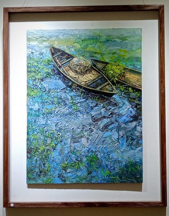 পৃথিবীর সেরা এবং সুন্দর জিনিসগুলো দেখা যায় না এমনকি স্পর্শও করা যায় না, সেগুলো হৃদয় দিয়ে অনুভব করতে হয়। তার প্রমাণ যেন শিল্পীর সৃষ্ট “ফিশিং বোট এট আড়িয়াল বিল” শীর্ষক চিত্রকর্মটির দ্বারা প্রকাশ পায় যা পার্শ্ববর্তী বার্ডস আই ভিউ পরিপ্রেক্ষিতে সৃষ্ট। শিল্পী বিলের সৌন্দর্যের সাথে ফুটিয়ে তুলেছেন মাছ ধরার মুহূর্তে চারপাশের পরিবেশ। যেখানে বর্ষার সকালের অথৈ জলরাশি আর সবুজ কচুরিপানার সমারোহে ভাসমান ডিঙ্গি নাও যার উপরে পরে আছে জেলেদের মাছ ধরার জাল । নদীর পানির তরঙ্গ, উপরে আকাশের প্রতিবিম্ব ও কচুরিপানার যোগসূত্রের দৃশ্য প্রকাশ করে প্রাকৃতিক সৌন্দর্য ও নির্মলতা, জীবন্ত পরিবেশ এবং স্থিরতা ও গতিশীলতার সহাবস্থান। জন্মসূত্রে মুন্সিগঞ্জের চিরচেনা এই বিল তার স্মৃতির পাতায় সময়ের স্রোতে হারিয়ে যাওয়া মুহূর্তগুলোকে বাঁচিয়ে রেখেছে ।